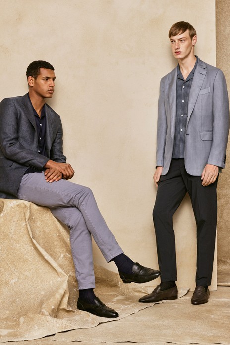 左/ジャケット¥240,000、パンツ¥69,000、ニット¥150,000、シューズ¥155,000 右/ジャケット¥240,000、パンツ¥69,000、シャツ¥105,000、シューズ¥171,000(すべて税抜き価格)