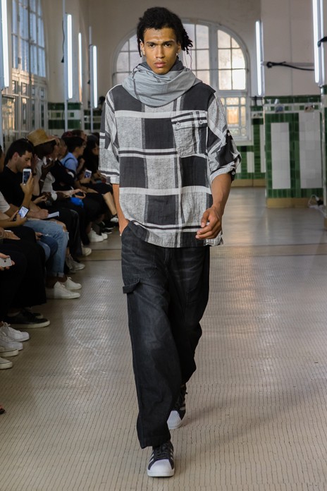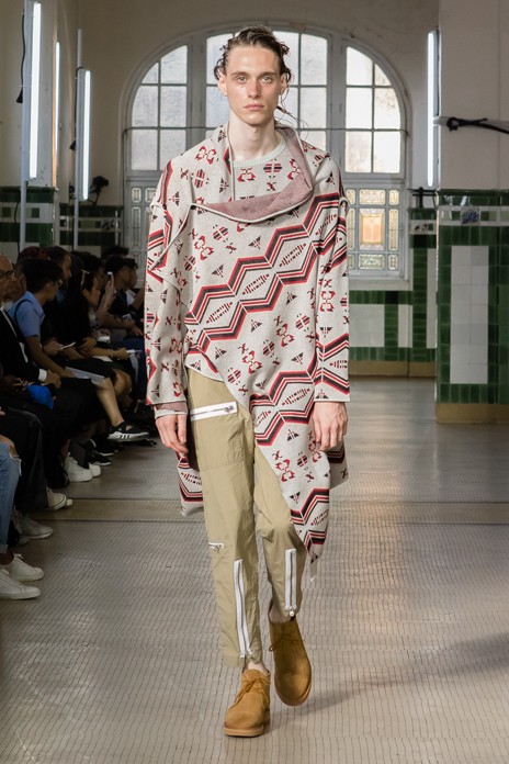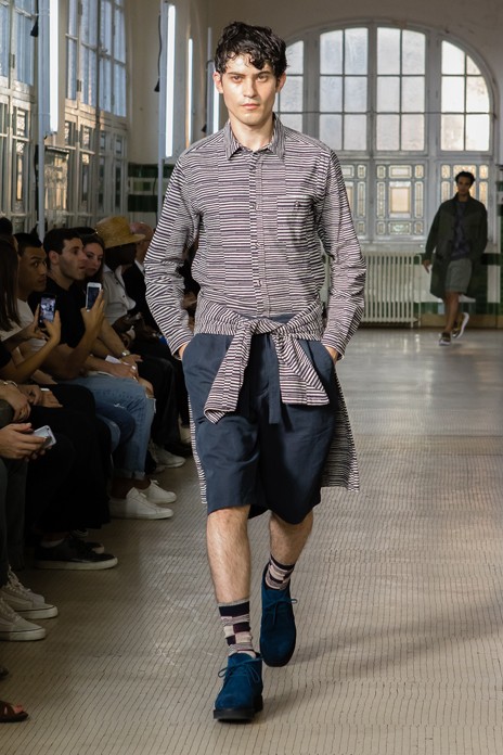 キーカラーをブルー、ネイビーに絞り込み、日本古来の書道の筆を用いたアクションペインティングを施した印象的な柄や、ブランドが得意とするプリミティブなモチーフを展開しウェアと組み合わせた。
