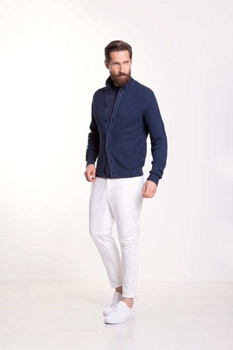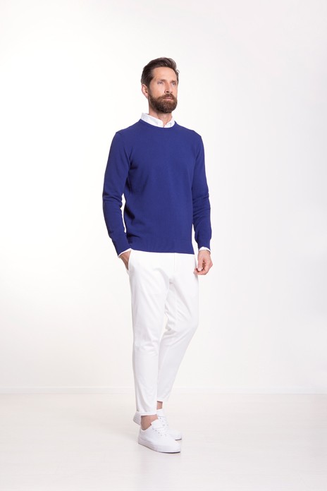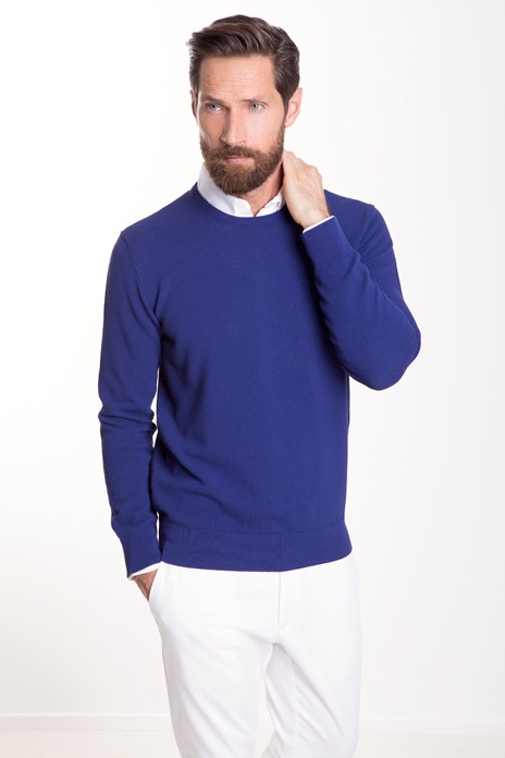 SS18はイタリア各地の海をキーカラーに反映させています。深みのあるタオルミーナのマリンカラーや、ポルトチェルボはアクアマリン、ポンツァの荒々しいブルー、そして非常に有名なカプリブルーがキーカラーで、エクスクルーシヴ素材とやわらかな天然素材(絹、綿、ウール、カシミヤ)を非常に高い技術で組み合わせたモダンでインフォーマルなコレクションです。革新的な非常に細い綿糸から織ったクレープ生地やマココットンのプルオーバー、ポロやTシャツには綿や麻のジャージー、ピケを使いCrucianiならではのエレガンスコンフォートを表現しました。